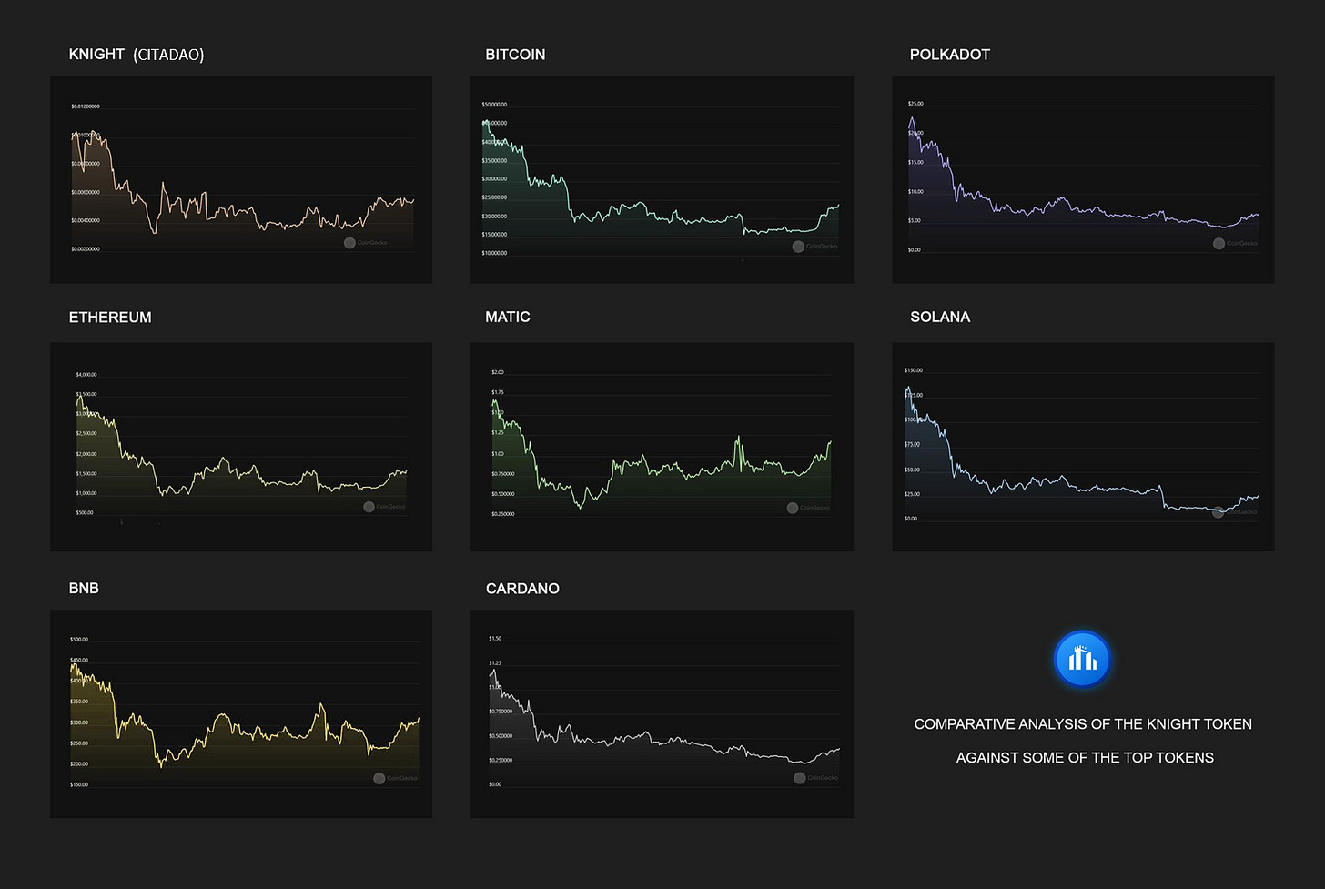 CitaDAO addresses the drawbacks of traditional real estate to deliver on its belief that Real Estate on-chain will transform DeFi and grow existing DeFi markets, such as collateralized loans, into a trillion-dollar TVL ecosystem. In addition, the team has devised a strategic plan to tackle the challenges investors face in tokenized real estate by emphasizing deep liquidity to sustain against swift price actions. A comparative analysis of the KNIGHT token during the last six months of the bear market against some of the top tokens (by MCAP) reveals the strong performance of this asset-backed class. While most of the tokens have suffered heavily on the count of Terra & FTX’s contagion, KNIGHT has maintained a steady price.